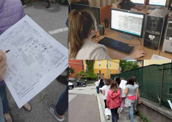 Struttura delle lezioni: A ciascuna classe sono stati proposti 2 laboratori da 2 ore ciascuno. Durante la prima ora di lezione, si è esposto il valore dei beni digitali creati collaborativamente, prendendo come esempio Wikipedia e OpenStreetMap. Agli alunni sono state quindi consegnate mappe su carta della zona circostante la scuola (create sul sito FieldPapers), e si è usciti a rilevare punti sul territorio, come segnali stradali, numeri civici, idranti, panchine. Nella seconda lezione da due ore si è andati in laboratorio e usato il servizio CrowdMap per creare una mappa di classe in modo collaborativo al computer. Infine, si è utilizzato il tutorial online di OpenStreetMap per imparare come si inserisce un punto nella vera OpenStreetMap.